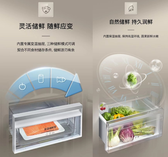 消費(fèi)者追求更高質(zhì)量的生活品質(zhì),對(duì)食材儲(chǔ)鮮講究精細(xì)化。西門子無界平嵌對(duì)開門冰箱打造“科學(xué)分儲(chǔ)”的理念,設(shè)有變溫儲(chǔ)鮮室和自然儲(chǔ)鮮室,應(yīng)對(duì)消費(fèi)者對(duì)不同食材的分類儲(chǔ)鮮需求,實(shí)現(xiàn)靈活儲(chǔ)鮮。變溫儲(chǔ)鮮室設(shè)置了智能三檔變溫,無論是飲料、果蔬還是魚肉,都能在該抽屜找到最合適的儲(chǔ)鮮條件。此外,針對(duì)綠葉蔬菜這類要求高濕儲(chǔ)鮮環(huán)境的果蔬,這款冰箱另設(shè)自然儲(chǔ)鮮室,搭載高濕度保護(hù)蓋板確保抽屜內(nèi)透氣不透濕,能夠保持綠葉蔬菜長久水嫩新鮮。