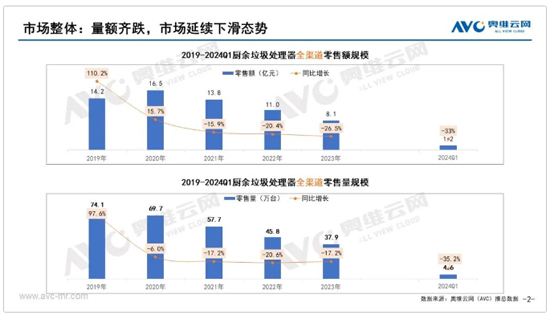 2024年第一季度廚余垃圾處理器整體市場規(guī)模延續(xù)下滑態(tài)勢,奧維云網(wǎng)(AVC)推總數(shù)據(jù)顯示,2024年一季度廚余垃圾處理器市場全渠道累計零售額1.2億元,同比下降33%;累計零售量為4.6萬臺,同比下降35.2%。降幅進一步擴大。
