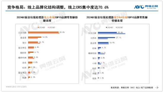 從品牌競爭來看,目前廚余垃圾處理器中以貝克巴斯、愛適易、唯斯特姆等為代表的垂直專業(yè)類品牌競爭優(yōu)勢明顯,2024年一季度廚余垃圾處理器線上市場前5品牌零售額集中度達到70.6%,線下KA市場前5品牌零售額集中度達到82.6%。另外像卡薩帝等綜合類品牌在線下KA渠道增長也比較明顯。