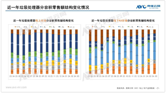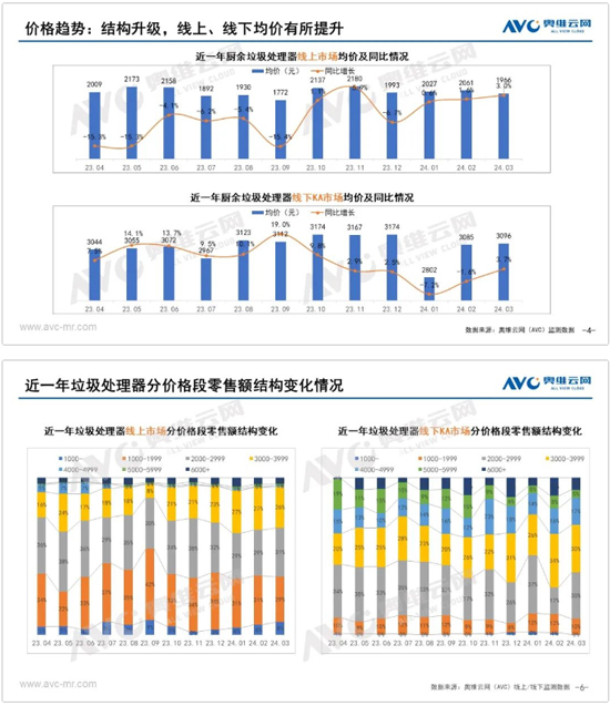 從價格趨勢來看,2024年3月廚余垃圾處理器市場均價有所提升,線上市場平均單價1966元,較同期增長3.0%。線下KA市場平均單價3096元,較同期增長3.7%。在從各價位段零售額結(jié)構(gòu)占比來,線上與線下KA市場5000元以上高價位段產(chǎn)品受消費環(huán)境影響,均有所收窄。