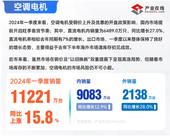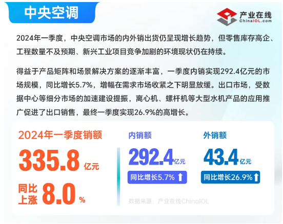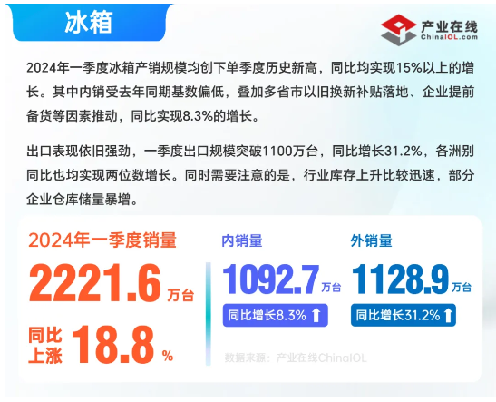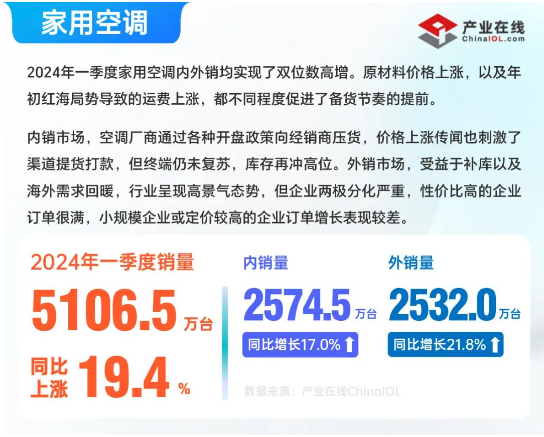 產(chǎn)業(yè)在線發(fā)布的一季度全產(chǎn)業(yè)鏈數(shù)據(jù)顯示,大部分行業(yè)實(shí)現(xiàn)了首季開門紅,其中,冰空洗三大白電上下游產(chǎn)業(yè)鏈全線實(shí)現(xiàn)良好增長?傮w來看,一季度的內(nèi)外銷市場表現(xiàn)進(jìn)一步分化,不同行業(yè)走勢(shì)差異較大,制冷劑受配額政策影響,內(nèi)銷表現(xiàn)明顯好于出口。