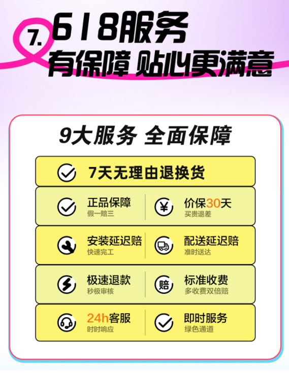有好價(jià)格,更要有好服務(wù)。618期間,蘇寧易購?fù)瞥霭?天無理由退換貨、假一賠三、價(jià)保30天、安裝延遲賠、配送延遲賠、極速退款、多收費(fèi)雙倍賠、24小時(shí)客服響應(yīng)、綠色通道在內(nèi)的“九大安心服務(wù)”,助力消費(fèi)者無憂消費(fèi)。