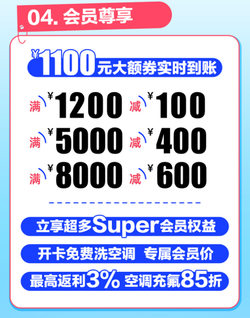 今晚8點(diǎn)至6月2日,Super會員可領(lǐng)取專屬大額優(yōu)惠券,滿1200元減100、滿5000元減400及滿8000元減600。