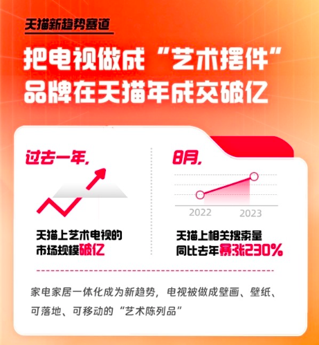有人追求好音質(zhì)好畫質(zhì),還有人追求極致家居美學。強調(diào)觀賞性、裝飾性的藝術(shù)電視自然成為家庭新寵。2023年末,京東發(fā)布的一份《消費者更喜愛的平板電視年度熱賣榜》顯示,京東藝術(shù)電視自年初以來的銷售超預期,成交額同比提升超過8倍。去年618期間,天貓也有數(shù)據(jù)顯示,藝術(shù)類電視相關搜索量同比上年增長230%。
