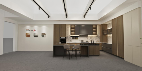 「君悅」以深咖色和淺咖色麗膚門板為主,以特色長(zhǎng)短拉手、特色厚薄 ABA 層板、45°斜切等創(chuàng)新元素為亮點(diǎn),通過材質(zhì)、肌理、色彩的變化,工藝交映融合,喚起空間的情緒,承載居住者在不同文化熏陶下的審美、思想和情感寄托,彰顯他們的身份與格局。