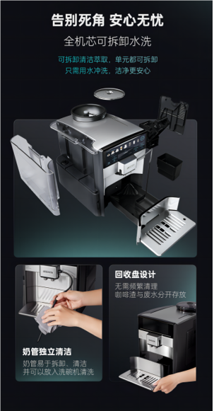大部分咖啡機(jī)的日常清潔很難兼顧衛(wèi)生死角,尤其是萃取殘留的咖啡渣、水箱殘水,還有蒸汽棒上殘留的奶沫,長(zhǎng)時(shí)間暴露在空氣中容易滋生細(xì)菌和霉菌,清理不徹底還會(huì)威脅用戶(hù)的身體健康。西門(mén)子全自動(dòng)咖啡機(jī)配備全機(jī)芯可拆卸水洗方案,確保萃取零件能夠徹底清洗,無(wú)衛(wèi)生死角。比起手動(dòng)清潔,這一設(shè)計(jì)極大提高了咖啡機(jī)清潔的智能化與便利化,還原咖啡原本的品質(zhì)和口感,讓用戶(hù)可以放心享用。