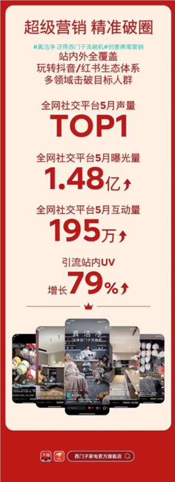 在線上,西門子洗碗機成功發(fā)布了618營銷活動,發(fā)起#真潔凈,還得是西門子家電#的社交媒體話題討論,通過大數(shù)據(jù)分析精準(zhǔn)定位目標(biāo)消費群體,深刻挖掘消費者日常生活中的真實洗碗痛點,通過在小紅書和抖音平臺創(chuàng)造了一系列富有創(chuàng)意且貼合中國消費者日常生活的視頻與圖文內(nèi)容。這些內(nèi)容在社交媒體上廣泛傳播,不僅提升了品牌曝光度,還實現(xiàn)了與消費者的深度互動。在活動期間引流站內(nèi)UV增長79%,全網(wǎng)社交媒體平臺5月曝光量1.48億,以互動量195萬達到5月社交媒體平臺聲量第一,成功將品牌信息有效觸達至更廣泛的潛在用戶群體,進一步加深了消費者對西門子洗碗機潔凈技術(shù)的認(rèn)知。