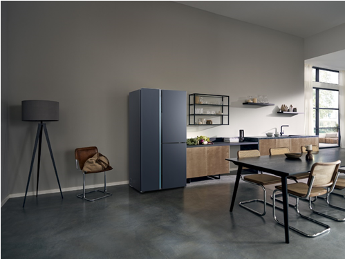 西門子AI超氧零度艙對(duì)開門冰箱在設(shè)計(jì)上也頗具匠心。機(jī)身左右只要預(yù)留2厘米的空間即可微縫嵌入櫥柜,即使在緊湊的空間里也能輕松擺放。加上其純平輪廓設(shè)計(jì)并巧妙的將把手和控制器融入機(jī)身之中,使得冰箱嵌入安裝之后可以與櫥柜渾然一體,在視覺(jué)上有效釋放廚房空間。此外,這款冰箱有湖蘊(yùn)藍(lán)金屬和冷霜銀金屬兩種配色可供選擇,搭配品牌獨(dú)有的藍(lán)色LOGO外部燈條,營(yíng)造出獨(dú)特的氛圍感,適合不同的家裝風(fēng)格。