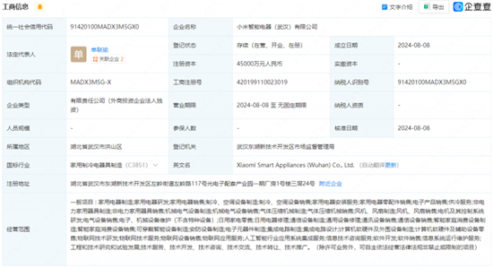 企查查資料顯示,2024年8月8日,由小米通訊技術有限公司全資控股的小米智能電器(武漢)有限公司成立,法定代表人為單聯(lián)瑜,注冊資本4.5億人民幣,經營范圍涉及家用電器的制造、研發(fā)、銷售、安裝等,其工商注冊所屬國標行業(yè)分類為“家用制冷電器具制造(C3851)”,該分類標準主要囊括空調、冰箱、冷柜等制冷器具制造。