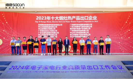 在會(huì)議的第十屆中國電子家電出口百強(qiáng)統(tǒng)計(jì)發(fā)布活動(dòng)中,帥康電氣從眾多品牌中脫穎而出,榮膺2023年十大煙灶熱(煙機(jī)、灶具、熱水器)產(chǎn)品出口企業(yè)的榮譽(yù)稱號(hào),贏得了行業(yè)內(nèi)外的一致認(rèn)可。此次會(huì)議聚集了國家商務(wù)部、浙江省商務(wù)廳、慈溪市人民政府、數(shù)百家電子家電企業(yè)、國內(nèi)外出海賦能與跨境電商企業(yè)等各方人士代表,規(guī)模盛大,極具權(quán)威。會(huì)議期間,各方共同探討了新格局下的競爭態(tài)勢,交流了下半年世界經(jīng)濟(jì)貿(mào)易趨勢、對(duì)外貿(mào)易政策、國別貿(mào)易風(fēng)險(xiǎn)與應(yīng)對(duì)策略,以及綠色低碳賦能電子家電產(chǎn)業(yè)等重要議題。