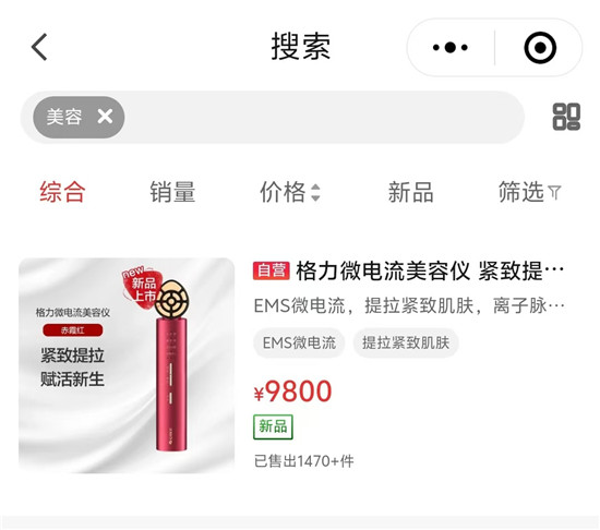 目前,格力美容儀產(chǎn)品已經(jīng)在微信小程序“格力董明珠店”上架,顯示累計銷售1470臺。