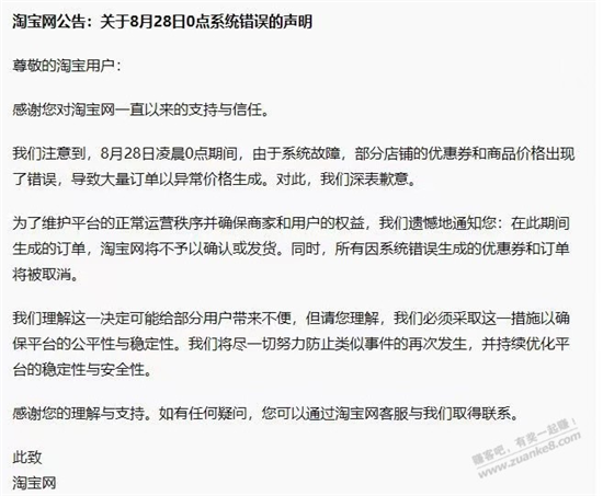 在接近早晨的時候,淘寶終于發(fā)出了相關(guān)聲明,稱0點的BUG價為系統(tǒng)錯誤,并且再次期間生成的訂單不予確認或發(fā)貨,同時相關(guān)優(yōu)惠券和訂單也將被取消。