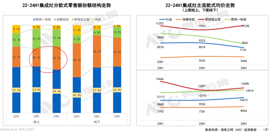 很明顯的一個特征就是“基礎(chǔ)款產(chǎn)品回暖”,據(jù)奧維云網(wǎng)(AVC)監(jiān)測數(shù)據(jù),2024年上半年消毒柜款線上市場份額同比增長5.8個百分點。而作為市場的升級款式,蒸烤一體和蒸烤獨立款份額上略微降低。