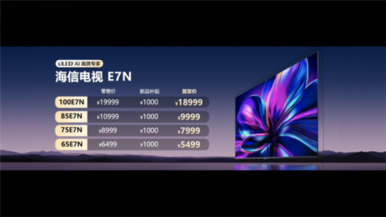 海信AI電視E7N提供了65/75/85/100吋四個(gè)版本,零售價(jià)分別是6499元、8999元、10999元、19999元,首發(fā)享受體驗(yàn)金1000元,到手價(jià)5499元、7999元、9999元、18999元,9月29日0點(diǎn)正式開(kāi)售;同時(shí)享受3000元政企雙補(bǔ)(2000元1級(jí)能效政府至高補(bǔ)貼+1000元企業(yè)至高補(bǔ)貼),以及6000元套購(gòu)補(bǔ)貼(海信品質(zhì)家電全套購(gòu),滿額至高再補(bǔ)貼6000元)。