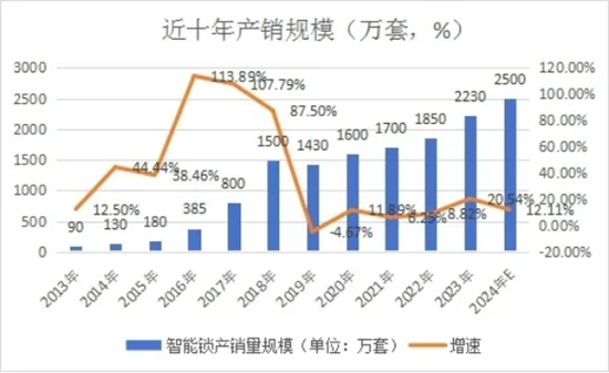 從中國日用五金技術開發(fā)中心發(fā)布的《2024年全國智能門鎖行業(yè)市場調(diào)研半年報》來看,近十年來中國智能鎖產(chǎn)銷規(guī)模進入穩(wěn)定增長階段,全球高端智能鎖市場規(guī)模也持續(xù)增長,市場空間巨大。根據(jù)日用五金數(shù)據(jù),2023年,全國智能門鎖產(chǎn)銷量達約2230萬套,同比增長12.7%;預計2024年智能門鎖行業(yè)產(chǎn)銷量將突破2500萬套。