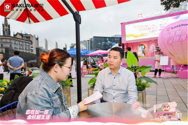 在熙熙攘攘的天一廣場,映入眼簾的焦點是以SAKURA櫻花品牌標(biāo)志性的粉色與秋日金色為主色調(diào)打造的大篷車。