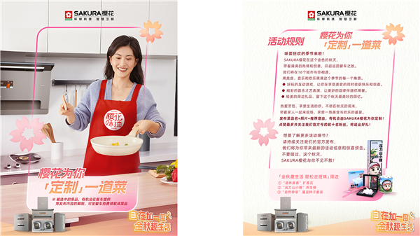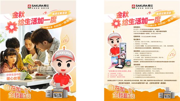 清新加一度、味蕾加一度、自在加一度……SAKURA櫻花金秋季全國巡展線上線下驚喜連連,關(guān)注官方微信公眾號(hào)、微博、小紅書、抖音號(hào),參與#金秋給生活加一度#與#你最愛的一道菜#話題互動(dòng),分享與SAKURA櫻花加一度的故事和最愛吃的一道菜,有機(jī)會(huì)贏取櫻花生活電器、「金秋趣生活輕松去班味」周邊等精彩好禮。
