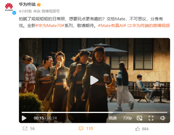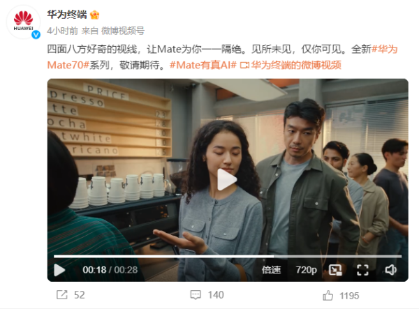 第一條以“一抓一放、掌控全場”為主題。視頻中主角在烹飪的時候通過一抓一放瞬間移動了小貓,整理了衣柜和餐桌,這條視頻主要講述的是“AI手勢”。眾所周知,隔空操控一直是華為手機的一個賣點,當(dāng)不方便接觸手機操作的時候,就可以使用隔空手勢翻閱網(wǎng)頁,操作音樂播放器等等。此條視頻大概率想透露的就是Mate70+AI將帶來手勢操控新玩法。