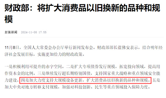 而在此前(11月8日)舉行的全國人大常委會辦公廳舉行新聞發(fā)布會上,財政部部長藍佛安表示,結(jié)合明年經(jīng)濟社會發(fā)展目標(biāo),實施更加給力的財政政策。其中一點就是加大力度支持大規(guī)模設(shè)備更新,擴大消費品以舊換新的品種和規(guī)模。