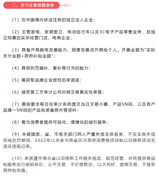 我們結(jié)合“湖北以舊換新活動商戶報名指引2.0”來看,2025年政策和2024年幾乎沒有變化,參與企業(yè)資質(zhì)條件仍舊比較嚴苛,比如在中國境內(nèi)依法注冊的獨立法人企業(yè);獨立結(jié)算的實體經(jīng)營門店、電商企業(yè);具備開具數(shù)電發(fā)票能力,銷售發(fā)票須開具給個人;具有防范騙補、套補等行為的能力;接受第三方審計公司對其交易真實性審查;需按要求每日在審計系統(tǒng)提交當(dāng)日交易小票、產(chǎn)品SN碼,以及有產(chǎn)品唯一SN碼的產(chǎn)品包裝盒照片等資料等等。