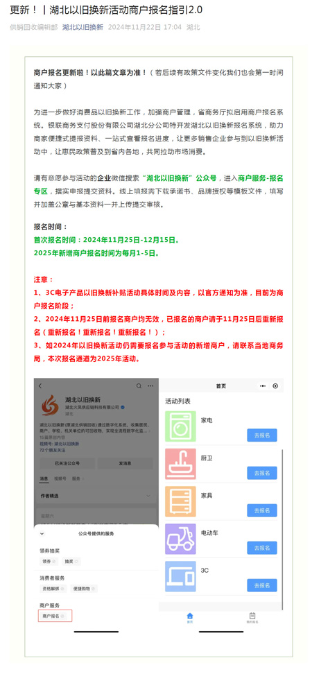 另外,有媒體報道,2025年湖北以舊換新活動商戶報名已經(jīng)開始,首次報名時間:2024年11月25日-12月15日。2025年新增商戶報名時間為每月1-5日。