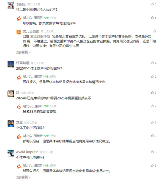 但是,值得一提的是,關(guān)于“小規(guī)模納稅公司和個體工商戶”能否能報名?“湖北以舊換新”的回復(fù)是,可以報名,但是具體審核結(jié)果視當(dāng)?shù)厣虅?wù)局審核情況決定。此外,2024年已經(jīng)參加并獲得資格的商家,2025年還需要重新報名申請。