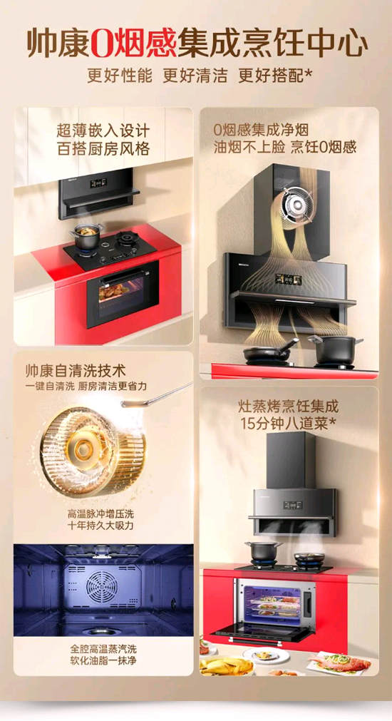 “更好性能、更好搭配、更好清潔”是這套產(chǎn)品的核心理念!案眯阅堋笔乔〉胶锰幍睦硇约,在平米間給用戶帶來更便捷的下廚體驗;“更好搭配”是產(chǎn)品的細節(jié)設(shè)計以及與櫥柜的出色的搭配方案,符合用戶對更高顏值的追求;“更好清潔”是產(chǎn)品自身具備自清洗功能,讓用戶清潔省心省力,解放雙手。