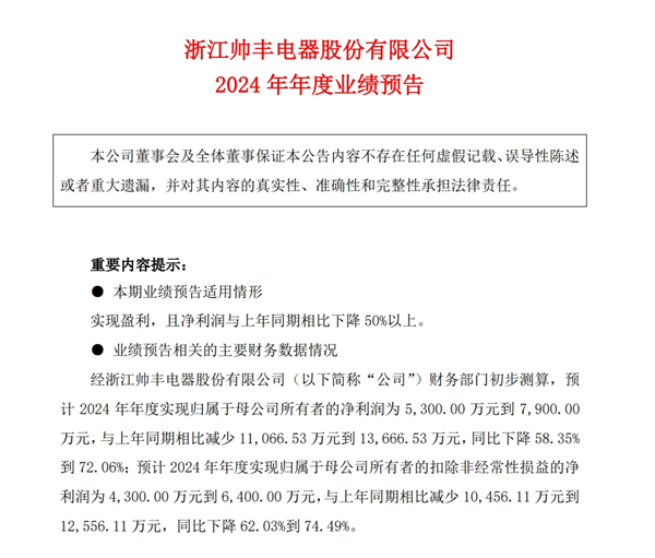 近期,帥豐電器正式對外公布了其2024年度財務(wù)預(yù)測報告,預(yù)計全年母公司凈利潤將介于5300萬元至7900萬元之間。與上一年度相比,該數(shù)值預(yù)計減少1.11億元至1.37億元,降幅達(dá)到58.35%至72.06%。同時,帥豐電器預(yù)計,扣除非常規(guī)損益后,母公司全年凈利潤將在4300萬元至6400萬元范圍內(nèi),與去年同期相比,同樣呈現(xiàn)顯著下滑,預(yù)計減少1.05億元至1.26億元,降幅約為62.03%至74.49%,引起了投資者及市場各界的廣泛關(guān)注與深入討論。