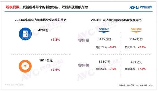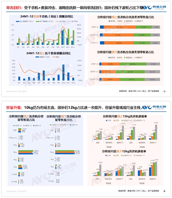 落實(shí)到洗護(hù)市場,據(jù)奧維云網(wǎng)(AVC)推總數(shù)據(jù),2024年中國洗衣機(jī)市場穩(wěn)中有進(jìn),全渠道零售量4297萬臺(tái),同比增長7.3%;零售額1014億元,同比增長7.6%。其中,線上/線下零售量同比分別增長9.0%/2.9%,零售額同比增長7.6%/7.6%,雙線均實(shí)現(xiàn)穩(wěn)健增長。從全年銷售節(jié)奏來看,因2023同期疫情導(dǎo)致基數(shù)較低,Q1洗護(hù)市場穩(wěn)健增長;進(jìn)入Q2.雖然洗衣機(jī)需求錯(cuò)峰表達(dá)仍有短期紅利,但整體家電消費(fèi)市場陡然轉(zhuǎn)冷,6.18節(jié)點(diǎn)的相對低迷,使單季度洗衣機(jī)量/額同比+0.3%/-4.3%;7、8月線下延續(xù)雙位數(shù)下跌。9月各地以舊換新政策陸續(xù)落地,高力度補(bǔ)貼下市場迎來轉(zhuǎn)機(jī),實(shí)體渠道逐步復(fù)蘇,為洗護(hù)市場的增長注入了新動(dòng)能。Q4全渠道洗衣機(jī)量/額同比+10.8%/+16.6%,帶動(dòng)全年洗護(hù)市場實(shí)現(xiàn)高增?傮w來看,2024年中國洗衣機(jī)市場在經(jīng)歷了一定的波動(dòng)后,依然實(shí)現(xiàn)了穩(wěn)健增長。此外,2025年第一批消費(fèi)品以舊換新資金810億已陸續(xù)下發(fā),這將為2025年洗護(hù)市場的平穩(wěn)發(fā)展提供有力保障。