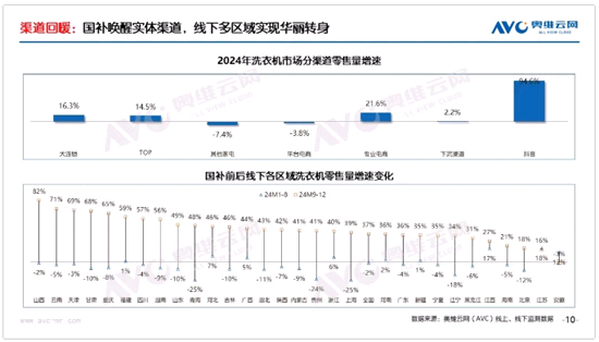 分渠道來看,線下渠道因資質(zhì)審核更加直接、客單價(jià)更高和購物體驗(yàn)更優(yōu)質(zhì),因而在國補(bǔ)中獲益更多。根據(jù)奧維云網(wǎng)(AVC)數(shù)據(jù),2024年1-8月線下KA/TOP/其它家電渠道洗衣機(jī)零售量同比分別+4.3%/-4.3%/-19.8%;而9-12月KA/TOP/其它家電渠道洗衣機(jī)零售量增速則達(dá)到31.9%/46.9%/17.2%。分區(qū)域來看,全國絕大多數(shù)省份國補(bǔ)后實(shí)現(xiàn)“華麗轉(zhuǎn)身”,以山西、云南為代表的8個(gè)省份國補(bǔ)后洗衣機(jī)零售量增速超50%,而國補(bǔ)前增速則為負(fù)數(shù)。此外,監(jiān)測數(shù)據(jù)反映,經(jīng)濟(jì)發(fā)達(dá)如北上廣蘇浙地區(qū),其國補(bǔ)后增速均持平或低于全國平均水平,這或許表明在經(jīng)濟(jì)較發(fā)達(dá)與欠發(fā)達(dá)地區(qū),洗衣機(jī)換新的潛在規(guī)模更大,以舊換新政策效果更加顯著。