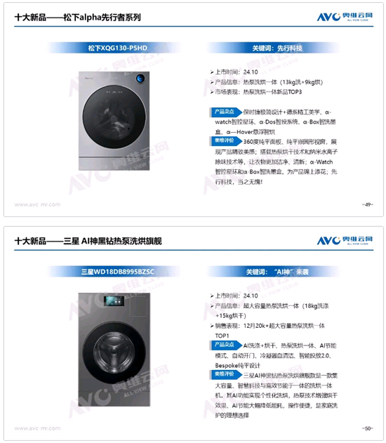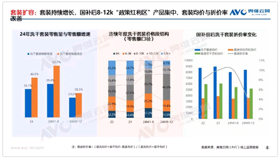 此外,2024年套裝延續(xù)高增長態(tài)勢。奧維云網(wǎng)(AVC)數(shù)據(jù)顯示,2024年線上洗干套裝零售量/額同比增長33.1%/46.5%。國補(bǔ)前后,套裝市場主要呈現(xiàn)三點(diǎn)變化:一是受同期雙十一節(jié)點(diǎn)高基數(shù)+國補(bǔ)流量稀釋影響,量額增速有所下滑;二是國補(bǔ)后套裝價(jià)格進(jìn)一步向8-12k的“國補(bǔ)紅利區(qū)間”集中,零售額占比由44.5%提升至61.1%,充分體現(xiàn)了消費(fèi)者的“薅羊毛”心理;三是國補(bǔ)后套裝折價(jià)率顯著下降,從2022年開始,企業(yè)為推動(dòng)套裝銷量增長,采取了加大套裝折價(jià)的方式。在國家補(bǔ)貼政策的推動(dòng)下,套裝價(jià)格已經(jīng)接近消費(fèi)者可接受范圍,因此企業(yè)不再需要依賴大幅折價(jià)來吸引消費(fèi)者。數(shù)據(jù)顯示2024年1-8月套裝折價(jià)率超10%,而國補(bǔ)后這一折價(jià)已下滑至4%,表明國補(bǔ)下,套裝正逐步擺脫價(jià)格內(nèi)卷的困境。