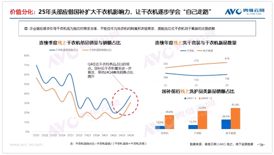 因而我們認(rèn)為,企業(yè)應(yīng)該借助國補(bǔ)這一契機(jī),進(jìn)一步深化對于干衣機(jī)的宣傳普及,讓干衣機(jī)真正學(xué)會(huì)“自己成長”,而不是淪為洗衣機(jī)的附屬需求,讓洗護(hù)產(chǎn)業(yè)未來能實(shí)現(xiàn)兩條腿走路。在國補(bǔ)中,我們也觀察到線上部分企業(yè)正積極引導(dǎo)消費(fèi)者分開購買洗衣機(jī)與干衣機(jī),數(shù)據(jù)體現(xiàn)干衣機(jī)單品占比在Q4顯著提升,這是讓干衣機(jī)獨(dú)立成長的良好信號。