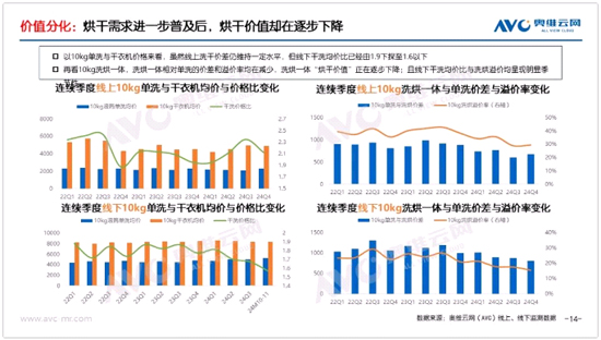第一,消費(fèi)者對于“烘干”價(jià)值的支付意愿在逐步減小,體現(xiàn)在對“烘干”這一屬性的定價(jià)在逐步降低。從獨(dú)立式干衣機(jī)與滾筒單洗的價(jià)格之比視角看,根據(jù)奧維云網(wǎng)(AVC)數(shù)據(jù),從2022年Q1-2024年Q4.線上10kg干衣機(jī)與10kg單洗價(jià)格之比由2.3下滑至2.1.現(xiàn)在這一比例則從1.9下滑至近1.5.干衣機(jī)相對洗衣機(jī)的價(jià)格在不斷下降;從洗烘一體相對單洗的溢價(jià)視角來看,2022年Q1-2024年Q4.雙線10kg洗烘一體相對10kg單洗的價(jià)差降低了約200元,線上溢價(jià)率由近40%下滑至30%,線下溢價(jià)率則由30%下滑至15%。如果認(rèn)為干衣機(jī)的價(jià)格代表了消費(fèi)者對于烘干價(jià)值的支付意愿,那么不論從絕對價(jià)格還是相對價(jià)格來看,洗護(hù)產(chǎn)業(yè)中的烘干價(jià)值都在不斷下滑。