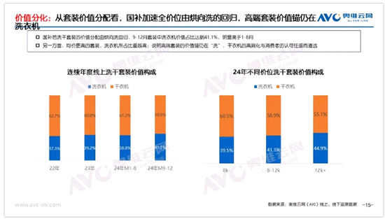 第二,從套裝的價(jià)值分配來看,從2022年開始,洗干套裝中洗衣機(jī)的價(jià)值占比就在不斷提升,奧維云網(wǎng)(AVC)數(shù)據(jù)顯示,從2022年-2024年M9-12.洗干套裝中洗衣機(jī)價(jià)值占比由37.3%提升至41.1%。此外,隨著洗干套裝價(jià)格由6k-提升至12k+,洗衣機(jī)價(jià)值占比也有39.5%提升至44.9%,這說明高端套裝的價(jià)值錨也正向中高端洗衣機(jī)傾斜,烘干對洗干套裝的加持正在逐步減弱。如果說干衣機(jī)是洗護(hù)產(chǎn)業(yè)升級和增量的重要抓手之一,那么現(xiàn)在其助推產(chǎn)業(yè)發(fā)展的效果正在逐步減弱。