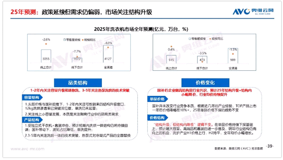 2014-2023年洗衣機(jī)市場零售量的復(fù)合增長率為1.6%,增速較為穩(wěn)定;從國家統(tǒng)計(jì)局頒布數(shù)據(jù)來看,2023年全國每百戶洗衣機(jī)保有量達(dá)98.2.接近戶均一臺(tái)水平,增量空間有限。因此在洗護(hù)市場需求較穩(wěn)定的背景下,24年國補(bǔ)很大程度上“前置”了2025年的需求。資金規(guī)模上,2024年H2(主要集中在Q4)消耗1500億消費(fèi)品以舊換新資金,而2025年第一批資金約810億,且品類有所擴(kuò)充,僅以現(xiàn)有資金規(guī)模推算,維持2024年需求刺激效果難度較大。因而2025年的洗衣機(jī)市場需求或難言樂觀。奧維云網(wǎng)(AVC)預(yù)測2025年全渠道洗衣機(jī)銷量為4127萬臺(tái),同比-4.0%;全渠道銷額為989億元,同比-1.5%。