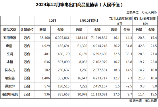具體來看,12月出口空調481萬臺,同比增長32.5%;1-12月累計出口6,159萬臺,同比增長28.3%。