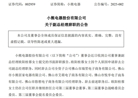 在前述職務(wù)辭去后,歐陽桂蓉仍將繼續(xù)擔(dān)任小熊電器的董事,以及戰(zhàn)略委員會和提名委員會的委員。截至公告發(fā)布之日,歐陽桂蓉個(gè)人持有小熊電器股份40.65萬股,占公司總股本的0.26%。