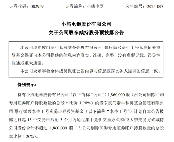 除了高管變動外,小熊電器還面臨著股東減持的壓力。1月13日,小熊電器還同步發(fā)布了股東減持公告。公告顯示,公司股東門泰牛私募基金管理有限公司旗下的景行振興泰牛1號私募證券投資基金(以下簡稱“泰牛1號”)計(jì)劃通過集中競價(jià)交易和/或大宗交易的方式,減持公司股份合計(jì)不超過186萬股。這一減持規(guī)模,占公司剔除回購專用證券賬戶持股數(shù)量后總股本的1.20%。