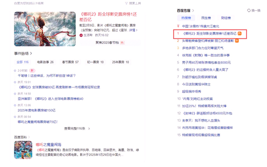 2月10日上午11點左右,“《哪吒2》距全球影史票房榜1還差百億”登上了百度熱搜榜一。據(jù)網(wǎng)絡(luò)平臺數(shù)據(jù)顯示,截至2月9日18時39分,影片《哪吒之魔童鬧!(簡稱《哪吒2》)票房(含預(yù)售)突破80億,成為全球影史第39部票房超過80億(人民幣)的影片。
