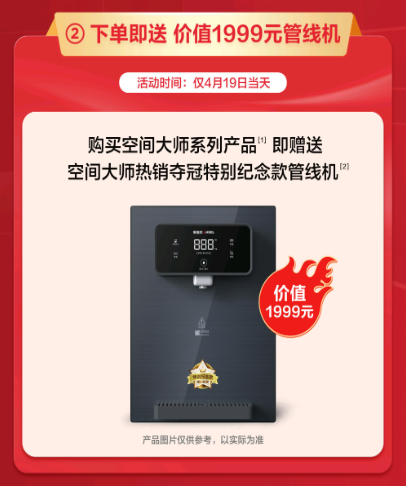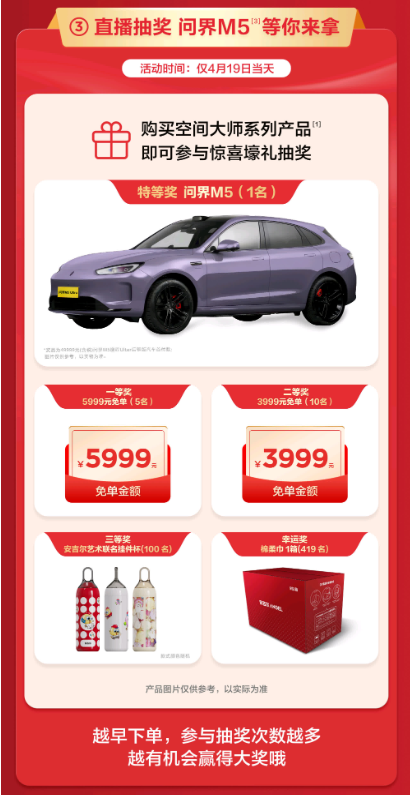 僅此419當(dāng)天,消費(fèi)者購買安吉爾空間大師系列全屋凈水,即可獲贈(zèng)價(jià)值1999元的空間大師熱銷奪冠特別款管線機(jī)。此外,安吉爾特別設(shè)置抽獎(jiǎng)活動(dòng),購買安吉爾空間大師系列全屋凈水的消費(fèi)者將進(jìn)入抽獎(jiǎng)池參與抽獎(jiǎng)活動(dòng),獎(jiǎng)項(xiàng)包括安吉爾藝術(shù)聯(lián)名掛件杯、5999元/3999元大額免單權(quán)益等,特等獎(jiǎng)更可獲贈(zèng)49999元問界M5汽車首付款。