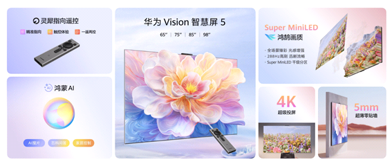 2025年4月16日,華為正式推出Vision系列首款搭載鴻蒙AI的智慧屏產(chǎn)品——華為Vision智慧屏 5.華為Vision智慧屏 5延續(xù)Vision系列年輕、時(shí)尚、多元的DNA,打造更懂年輕人的“潮酷巨幕手機(jī)”,以Vision系列的“三個(gè)首次”帶來(lái)越級(jí)體驗(yàn):首次接入鴻蒙AI,帶來(lái)AI搜片[1]、百科問(wèn)答等強(qiáng)大的AI功能體驗(yàn);首次升級(jí)Super MiniLED鴻鵠畫質(zhì),帶來(lái)更加卓越的畫面表現(xiàn);首次實(shí)現(xiàn)超薄零貼墻設(shè)計(jì),整機(jī)純平一體,背板離墻間隔僅5mm,視覺(jué)效果如壁畫纖薄,與各類家居環(huán)境完美融合。同時(shí),華為Vision智慧屏 5標(biāo)配華為靈犀指向遙控,在AI、音畫、外觀的多重飛躍升級(jí)加持下,一躍成為更懂年輕人的鴻蒙AI電視。