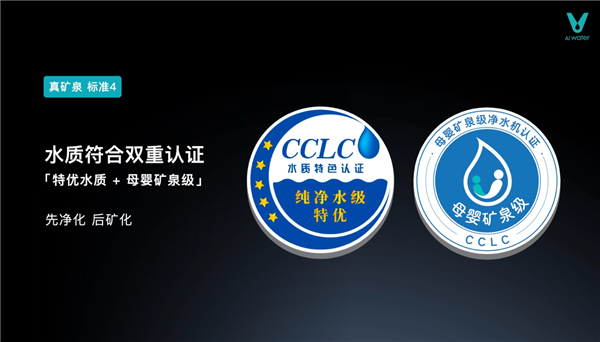 標(biāo)準(zhǔn)4:水質(zhì)符合雙重權(quán)威認證。水質(zhì)獲得“特優(yōu)水質(zhì)+母嬰礦泉級”雙重認證,先凈化后礦化流程,有效去除雜質(zhì)、細菌等有害物質(zhì)后,增添有益礦物質(zhì),保障飲水安全健康。