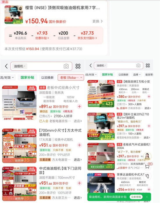 具體來看,櫻雪頂側(cè)雙吸7字機(jī)在國補(bǔ)后售價(jià)低至150元,這并不是個(gè)例,榮事達(dá)、萬寶、志高等品牌的多款油煙機(jī),價(jià)格皆跌破200元關(guān)口;萬和、萬家樂、蘇泊爾等廚電品牌,也推出大量售價(jià)400元左右的機(jī)型。值得關(guān)注的是,即便是行業(yè)頭部品牌老板、方太,也出現(xiàn)了多款500元左右的油煙機(jī)。這在以往618和雙11大促中是難以想象的。