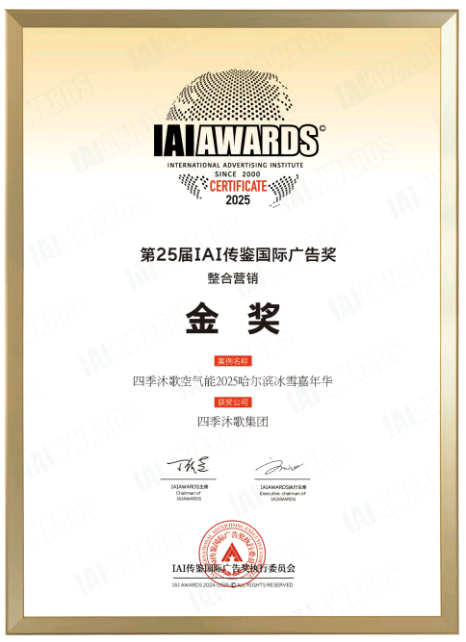 5月21日-22日,第25屆IAI傳鑒國(guó)際創(chuàng)意節(jié)頒獎(jiǎng)典禮在北京隆重舉行。四季沐歌空氣能憑借《2025哈爾濱冰雪嘉年華整合營(yíng)銷案例》斬獲“整合營(yíng)銷金獎(jiǎng)”,成為本屆賽事中清潔能源領(lǐng)域的標(biāo)桿獲獎(jiǎng)案例。這一榮譽(yù)不僅是對(duì)四季沐歌品牌創(chuàng)新力的高度認(rèn)可,也是對(duì)其25周年生日到來(lái)的熱烈慶賀,更是向其深耕清潔能源領(lǐng)域、積極推動(dòng)綠色低碳發(fā)展的致敬與獻(xiàn)禮。