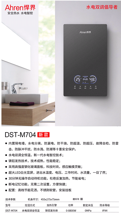 Ahren悍界DST-M702采用的高端的“鑄鋁發(fā)熱技術(shù)+水電雙調(diào)全恒溫+大屏幕顯示+內(nèi)置隔電墻”的產(chǎn)品平臺(tái),內(nèi)置隔電墻,應(yīng)用了防漏電、防干燒、防超壓、故障自檢、防雷擊、防脈沖干擾、防水濺、防潮等多種安全保護(hù),確保產(chǎn)品的安全。大屏幕顯示,電壓、進(jìn)水溫度,出水溫度、水流量一目了然。M702面板采用了高端的睿鏡鍍膜玻璃面板,具備鏡子一樣的效果。