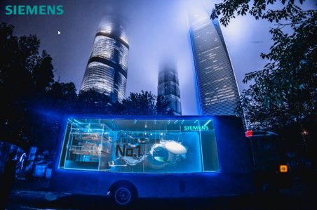作為本次巡展的視覺與體驗(yàn)核心,西門子洗碗機(jī)大篷車本身就是一個(gè)移動(dòng)的“科技藝術(shù)展廳”。車體圍繞“水與潔凈”的主題進(jìn)行構(gòu)建,通過靜態(tài)與動(dòng)態(tài)裝置并行、結(jié)構(gòu)與感官并重的設(shè)計(jì)語(yǔ)言,將品牌科技實(shí)力可視化。