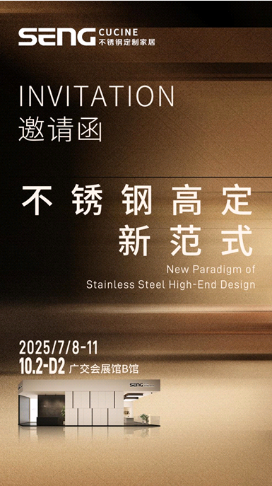 2025.7.8-7.11.SENG CUCINE將在2025中國建博會(廣州)上全球首發(fā)“臻境”、“雅境”、“意境”三大系列新品,誠邀您蒞臨廣交會展館B區(qū)設(shè)計定制展區(qū)10.2-D2.零距離鑒賞前沿不銹鋼工藝的非凡魅力,探索不銹鋼高定新范式賦予未來家居的無限可能!