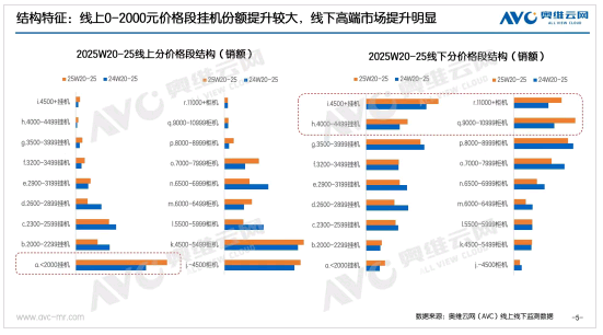 從價(jià)格結(jié)構(gòu)層面來(lái)看,線(xiàn)上渠道低價(jià)機(jī)型份額提升較大,線(xiàn)下渠道結(jié)構(gòu)升級(jí)明顯。奧維云網(wǎng)統(tǒng)計(jì)數(shù)據(jù)顯示,2025年618期間,線(xiàn)上市場(chǎng)<2000掛機(jī)占比從2024年的35.8%大幅上升至46.8%;在線(xiàn)下渠道,“4500+掛機(jī)”從18.33%從上升至22.05%;柜機(jī)“9000以上“的價(jià)格段占比上升明顯。