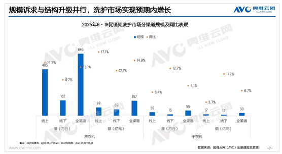 從零售規(guī)模來(lái)看,根據(jù)奧維云網(wǎng)推總數(shù)據(jù)顯示,2025年618期間,洗衣機(jī)在線(xiàn)上渠道零售規(guī)模達(dá)88 億元,同比增長(zhǎng)17.1% ;在線(xiàn)下渠道零售規(guī)模達(dá)69 億元,同比增長(zhǎng)12.1% ;全渠道合計(jì)157 億元,同比增長(zhǎng)14.9% 。