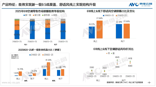 從產(chǎn)品結(jié)構(gòu)特征來(lái)看,產(chǎn)品能效升級(jí)全面普及。根據(jù)奧維云網(wǎng)統(tǒng)計(jì)數(shù)據(jù)顯示,2025年618期間,新一級(jí)能效產(chǎn)品線(xiàn)上線(xiàn)下占比均超95%。此外,618期間,舒適風(fēng)產(chǎn)品在線(xiàn)上渠道滲透率顯著上升,據(jù)奧維云網(wǎng)統(tǒng)計(jì)數(shù)據(jù)顯示,25年618期間,舒適風(fēng)空調(diào)在線(xiàn)上市場(chǎng)的銷(xiāo)額占比提升至27.66%。
